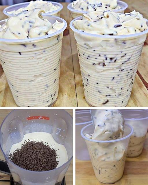 Ingredience: – 1 1/2 hrnku (čaj) šlehačky – 400 g slazeného kondenzovaného mléka – 200 g smetany ke šlehání – 1 balíček práškové šťávy s příchutí mučenky – Čokoládové posypky (dle chuti) Příprava: