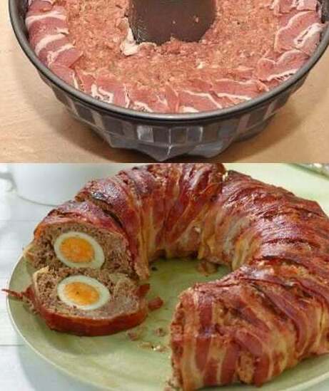 Ingredience: 800 g mletého hovězího masa 150 g slaniny (nakrájené na plátky) 4 vejce natvrdo 1 cibule (jemně nakrájená) 2 stroužky česneku (nasekané) 1 lžička hořčice 1 syrové vejce 100 g strouhanky Sůl a pepř Čerstvé bylinky (např. petržel nebo pažitka) Příprava: