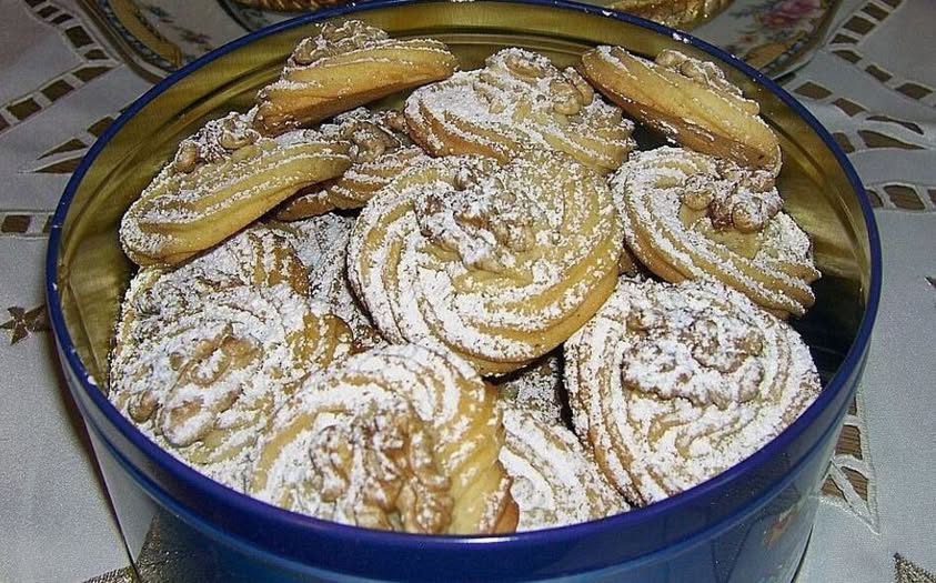 Ořechové sušenky Ingredience 1 balení vanilkového cukru 2 žloutky 370 g mouky 250 g másla nebo margarínu, měkkého 50 g medu 100 g moučkového cukru 3 lžíce mletých ořechů podle potřeby ořechy (asi 50 polovin) Práškový cukr na posypání Příprava