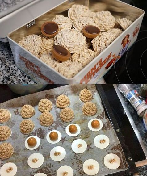 Ingredience 50 g cukru 1 špetka soli 1 vaječný bílek 100 g mletých lískových ořechů 1 balení cukrovinek (Toffifee, 15 kusů) 15 oplatek (50 mm) Příprava