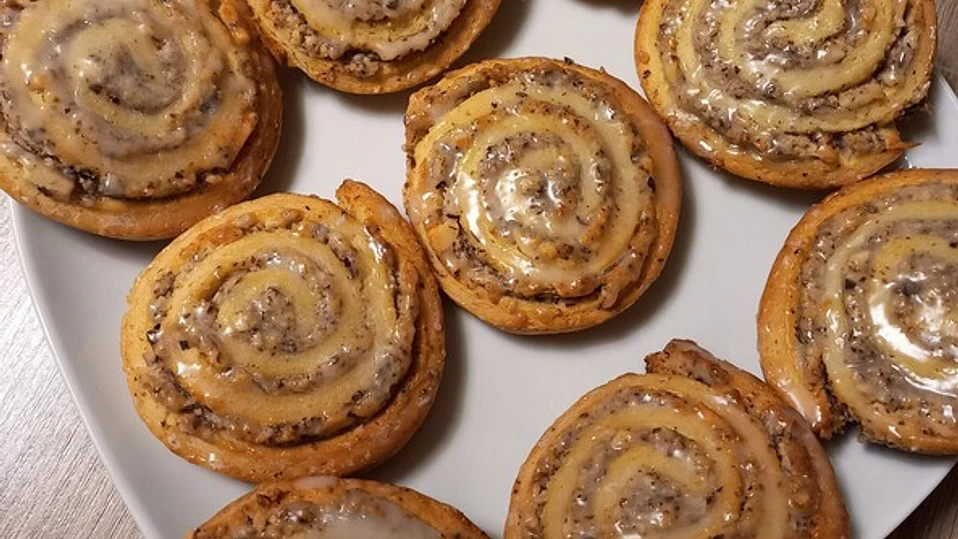 🍥 Šťavnaté ořechové šneky ⏱️ Čas přípravy: 1 hodina 🔥 Doba pečení: 40 minut 🕒 Doba kynutí / odležení: 1 hodina 🍽️ Porce: cca 18 šneků 🧺 Ingredience Na těsto: 500 g mouky 1 balení sušeného droždí 2 špetky soli 50 g cukru 2 žloutky 125 g másla 150 ml mléka (případně trochu více)