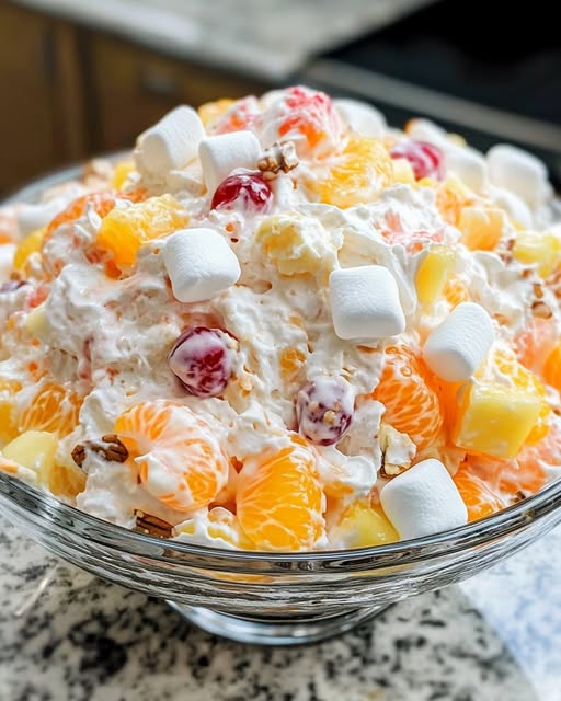Ingredience: 1 hrnek smetany ke šlehání 1/4 hrnku moučkového cukru 1/2 hrnku řeckého jogurtu nebo vanilkového 1 hrnek strouhaného kokosu 450 ml mandarinek, scezených 300 g kousků ananasu, scezených marakuja 1 1/2 hrnku mini marshmallow Volitelné