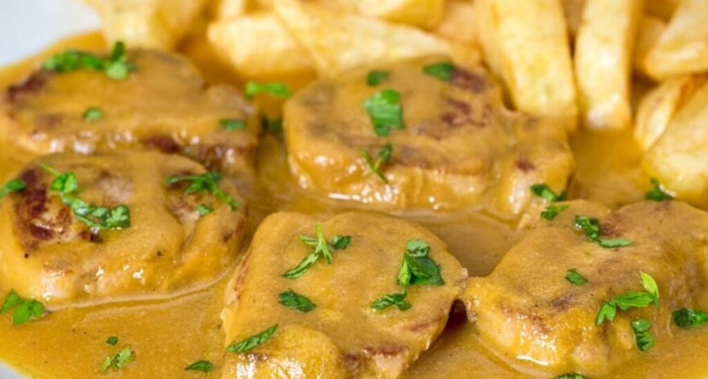Ingredience 1 vepřová panenka 1 cibule 1 mrkev 1 stroužek česneku 300 ml masného vývaru 100 ml bílého vína Sůl Mletý pepř 1 lžíce kukuřičného škrobu Olivový olej